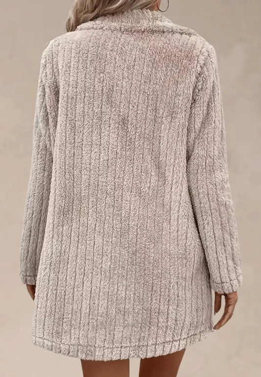 Beżowa kurtka damska polarowa długa z kieszeniami i guzikami