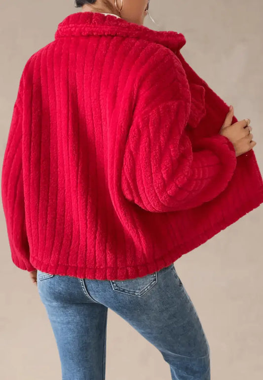 Czerwona kurtka damska polarowa krótka z guzikami i kieszeniami