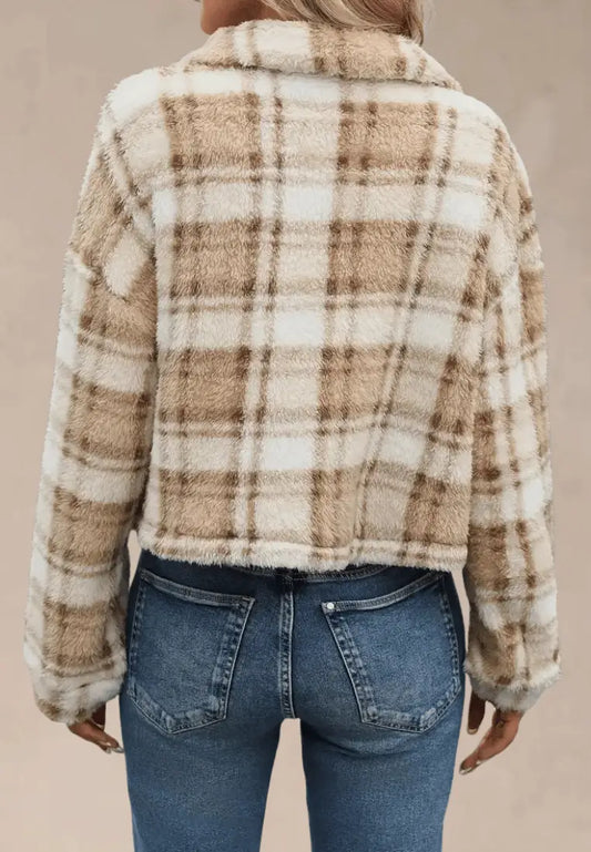 Nowy rok -69%Beżowa kurtka damska polarowa krótka w kratę na zamek