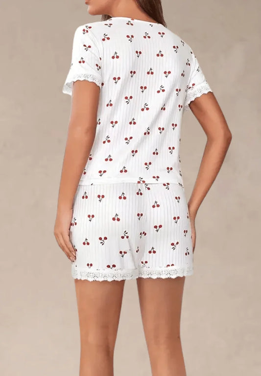 Biały komplet piżamowy damski z krótkim rękawem i spodenkami w wiśnie