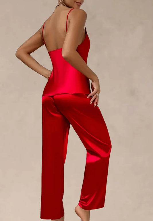 Czerwony komplet piżamowy damski satynowy na ramiączkach z długimi spodniami