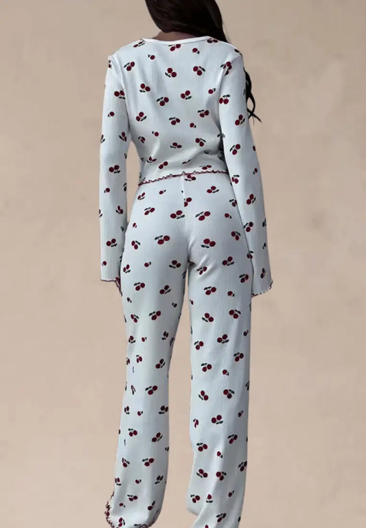 Biały komplet piżamowy damski z długim rękawem i długimi spodniami w wiśnie