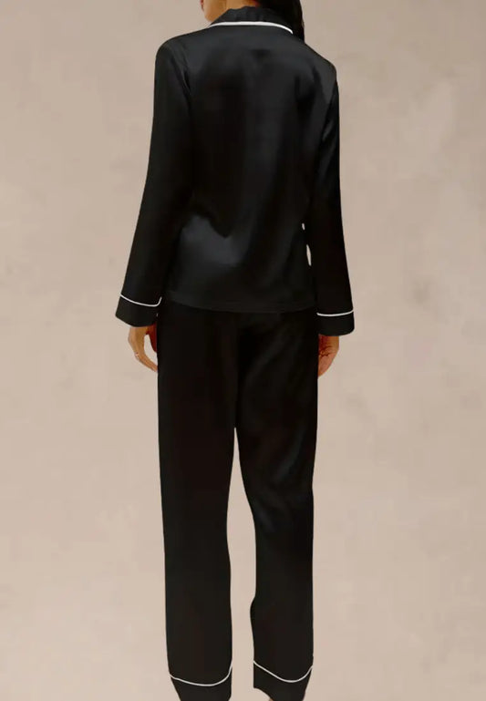 Czarny komplet piżamowy damski satynowy z długim rękawem i długimi spodniami