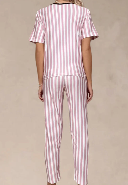 Różowy komplet piżamowy damski w paski z krótkim rękawem i długimi spodniami