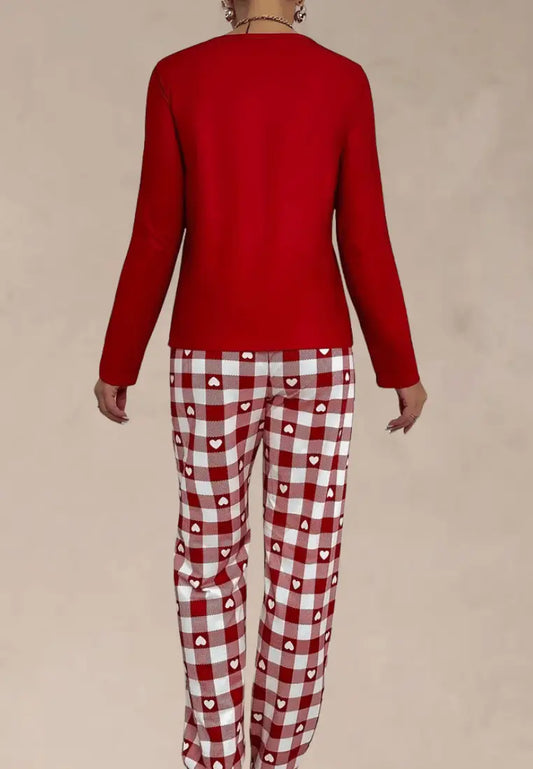 Czerwony komplet piżamowy damski z długim rękawem i długimi spodniami w kratę