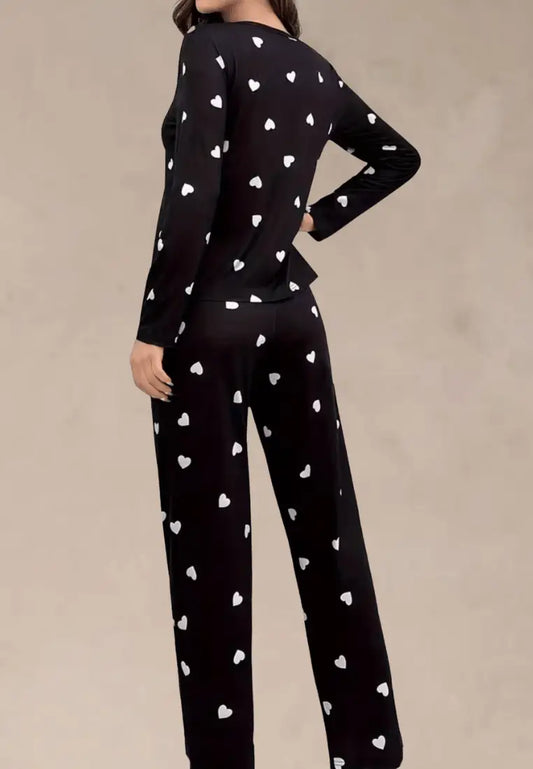 Czarny komplet piżamowy damski z długim rękawem i długimi spodniami w białe serca