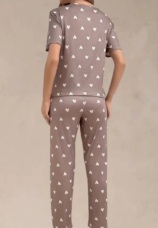 Brązowy komplet piżamowy damski z krótkim rękawem i długimi spodniami w białe serca