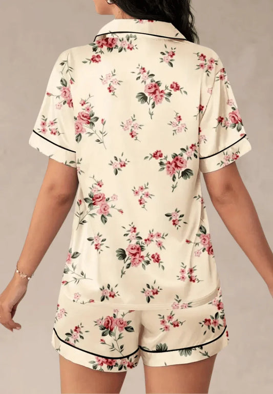 Kremowy komplet piżamowy damski w kwiaty z koszulą i spodenkami