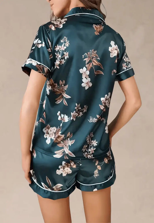 Zielony komplet piżamowy damski koszula i spodenki w kwiaty