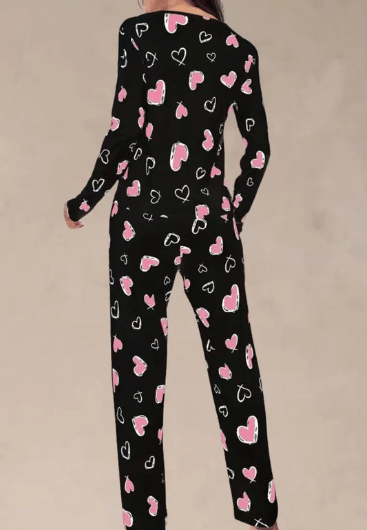 Czarny komplet piżamowy damski z długim rękawem i długimi spodniami w różowe serca