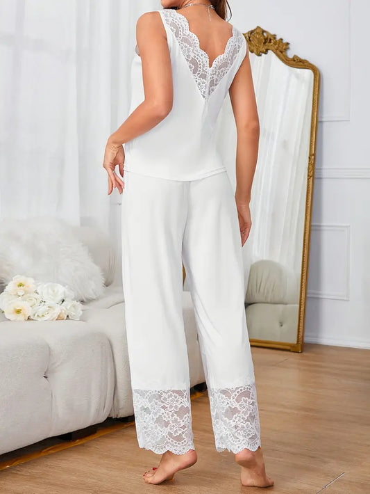 Komplet piżamowy z koronkowym dekoltem i szerokimi nogawkami z koronką Biały