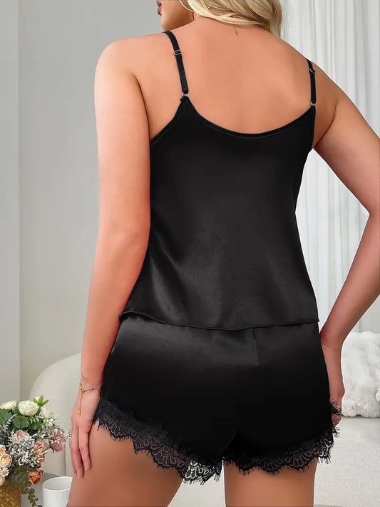 Satynowy komplet piżamowy z koronką Czarny