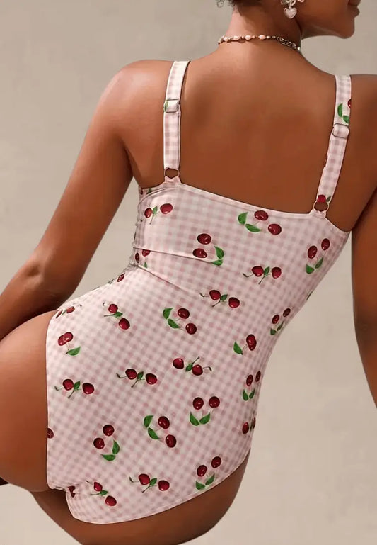 Różowy strój kąpielowy jednoczęściowy damski w kratkę z motywem wiśni