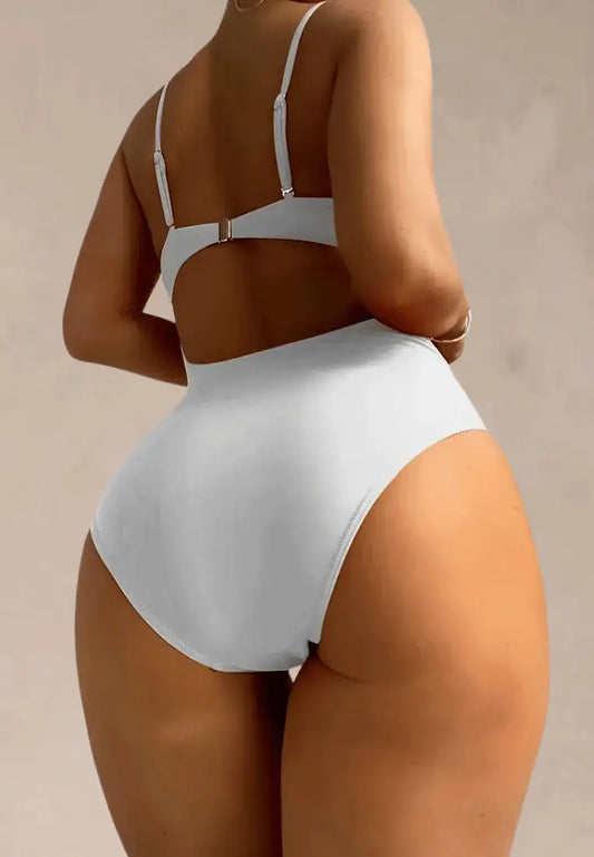 Biały strój kąpielowy jednoczęściowy damski z efektownym wycięciem pod biustem