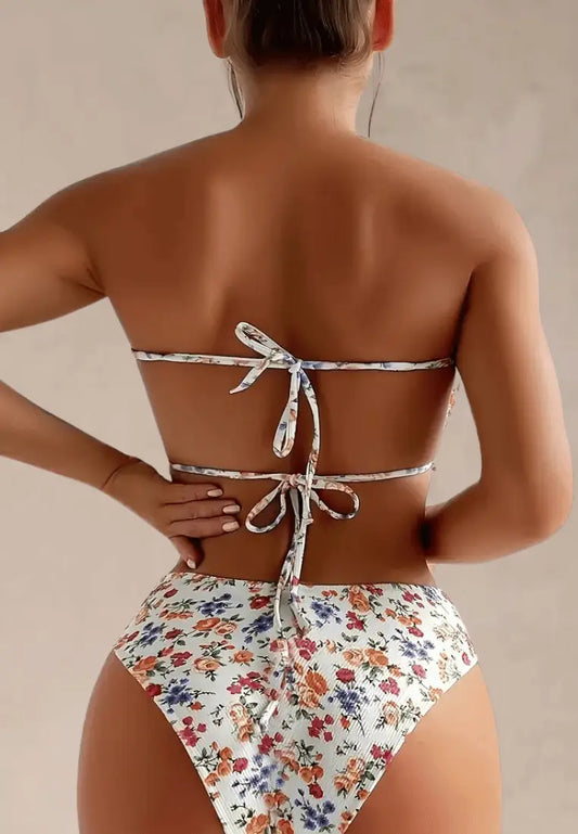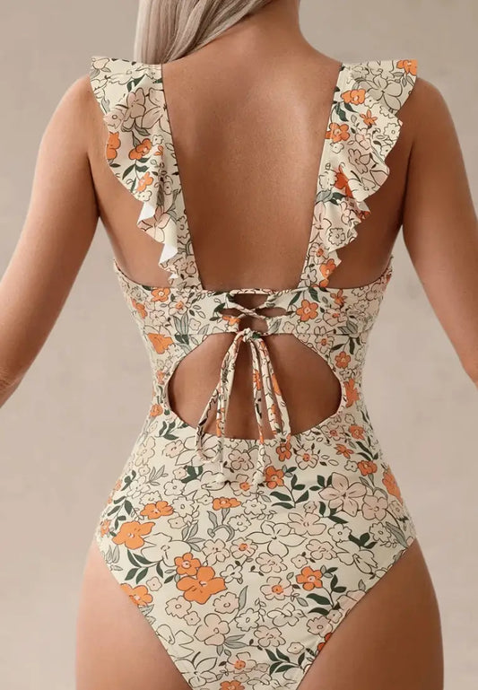 Kremowy strój kąpielowy jednoczęściowy damski w kwiaty z delikatną falbanką