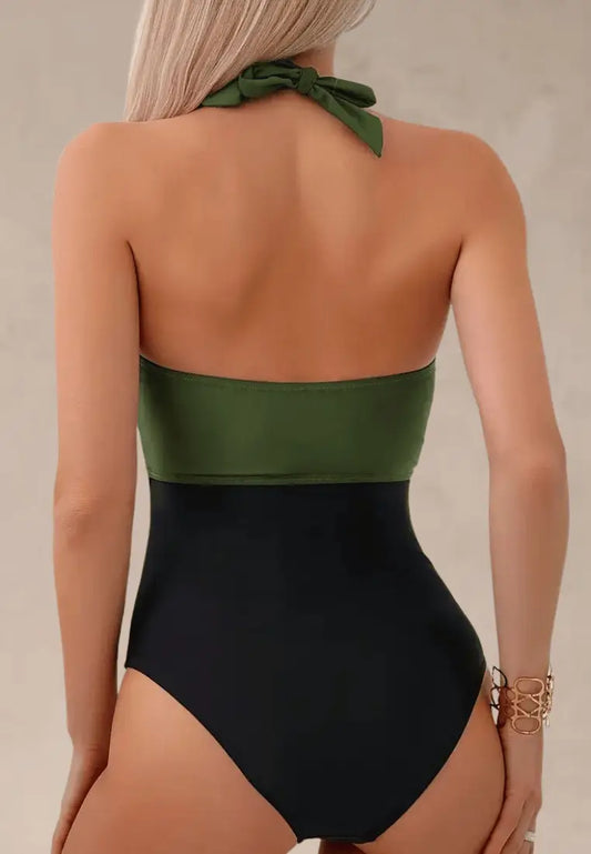 Zielony strój kąpielowy jednoczęściowy damski z czarnym dołem i wiązaniem