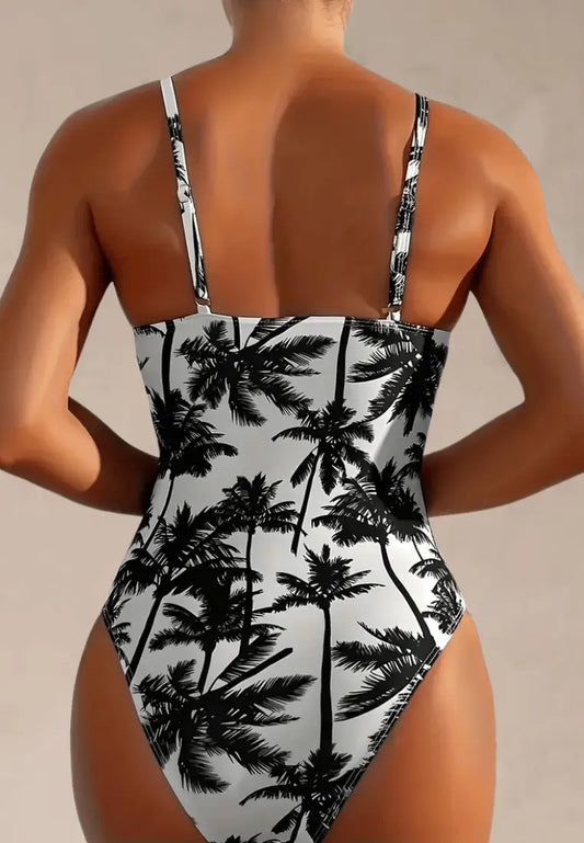Biały strój kąpielowy jednoczęściowy damski w palmy z efektownym wycięciem