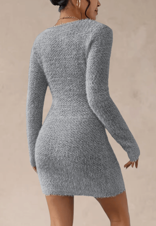 Szara sukienka dzianinowa z długim rękawem i okrągłym dekoltem