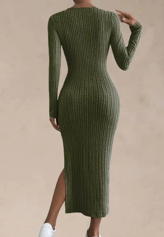 Khaki sukienka dzianinowa maxi z rozcięciem i długim rękawem