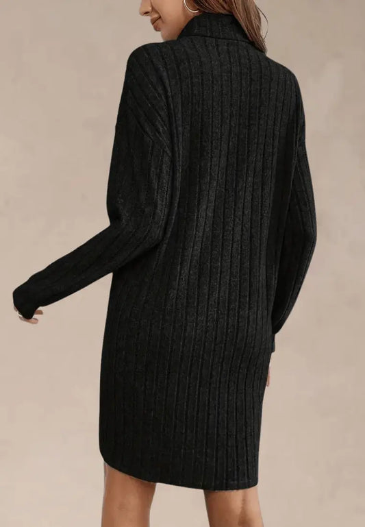 Czarna sukienka dzianinowa prążkowana z golfem i długim rękawem