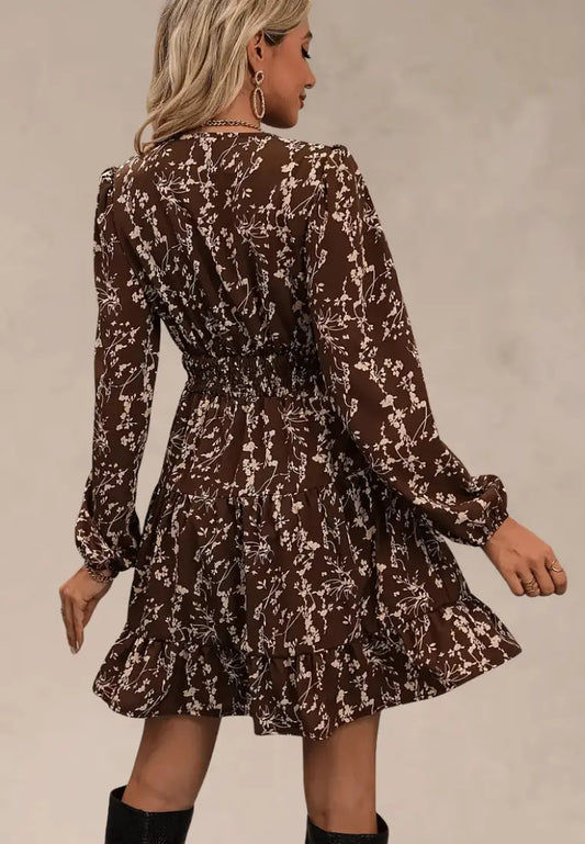 Brązowa sukienka w kwiaty z marszczeniem i długim rękawem