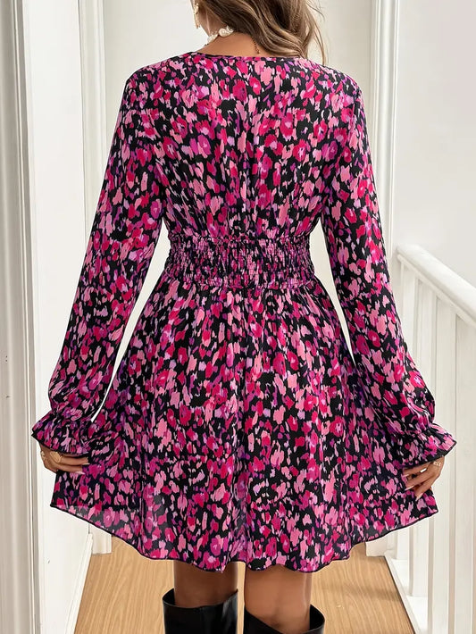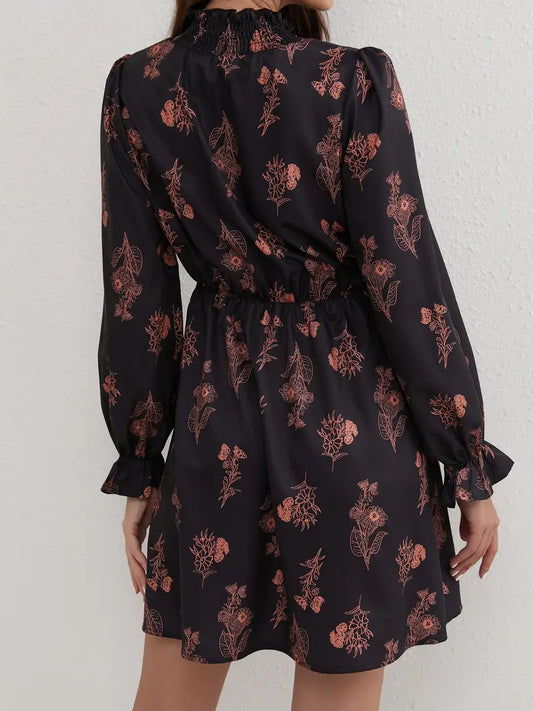 Krótka brązowa sukienka w kwiaty z długim rękawem i marszczeniem w talii