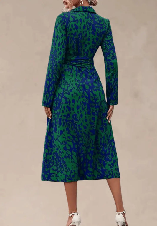 Niebiesko-zielona sukienka kopertowa z kołnierzem i paskiem