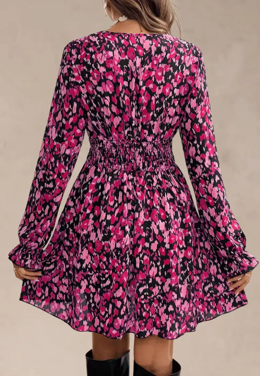 Różowa sukienka z printem kopertowa marszczona z długim rękawem