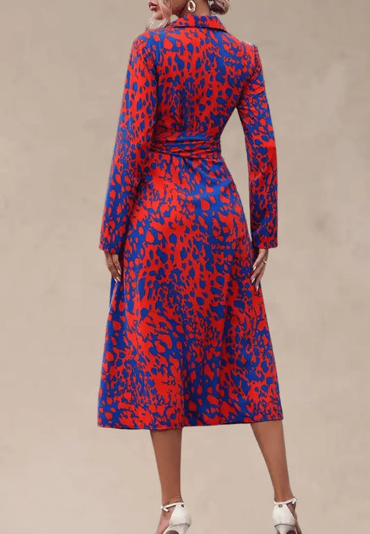 Niebiesko-czerwona sukienka kopertowa z kołnierzem i paskiem