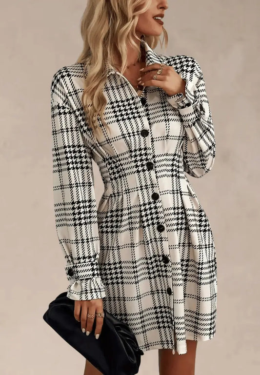 Biało-czarna sukienka koszulowa w pepitkę z długim rękawem i kołnierzykiem