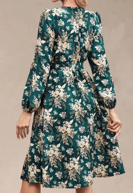 Zielona sukienka midi w kwiaty z paskiem i długim rękawem