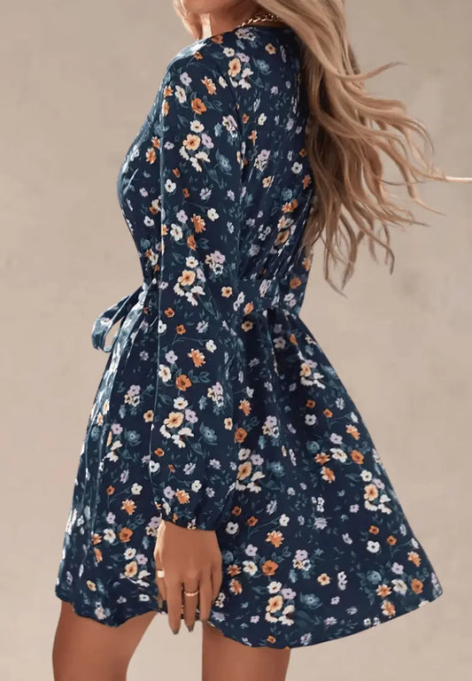 Nowy rok -69%Granatowa sukienka w kwiaty z paskiem i długim rękawem