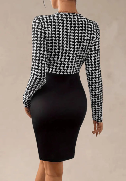 Nowy rok -69%Czarno-biała sukienka z dekoltem V i wzorem pepitki