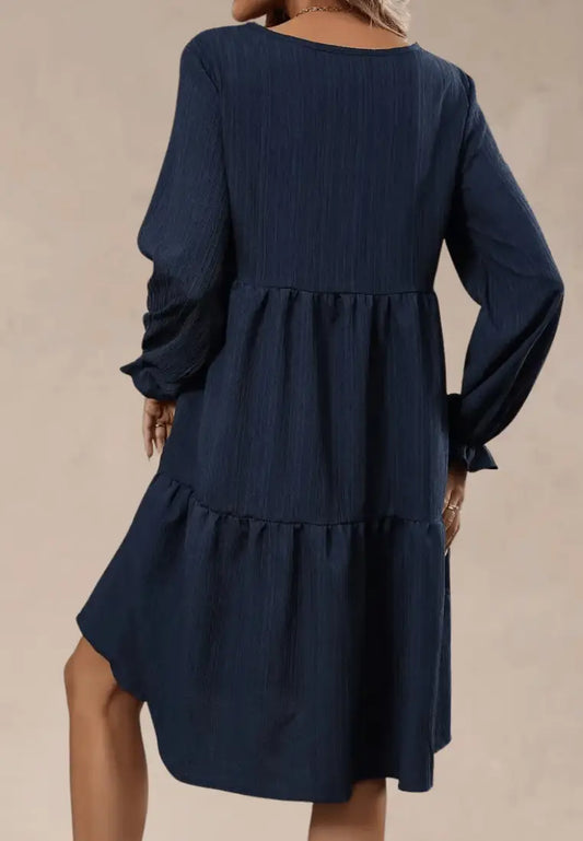 Granatowa sukienka z rozkloszowanym dołem i długim rękawem