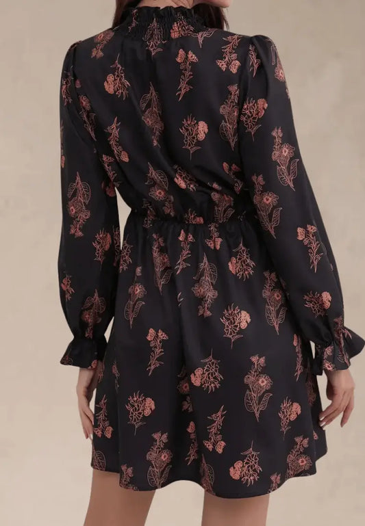 Czarna sukienka w drobne kwiaty z długim rękawem i stójką