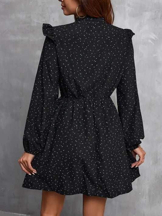 Czarna sukienka z wiązaniem pod szyją i drobnym wzorem