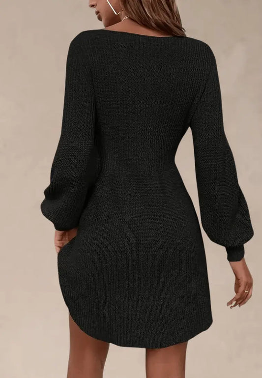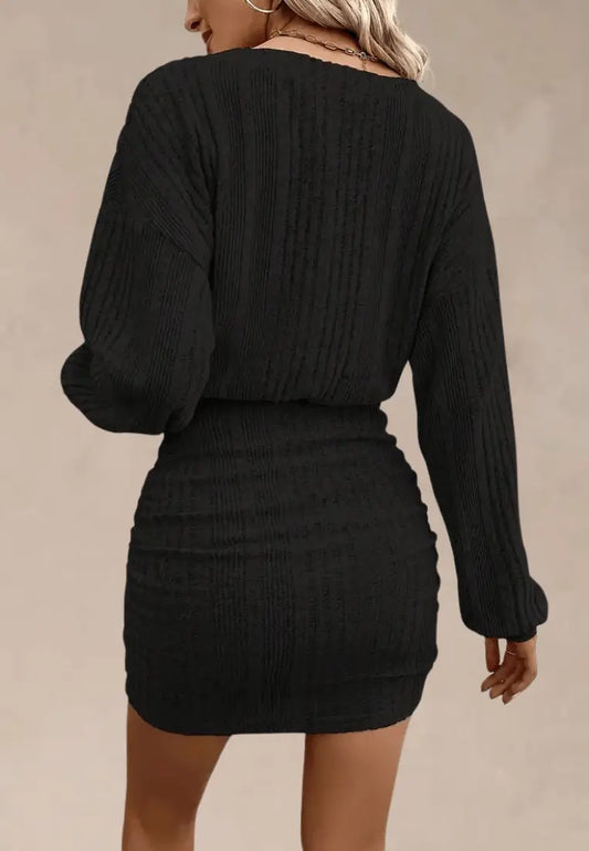 Nowy rok -69%Czarna sukienka dzianinowa z dekoltem V i długim rękawem