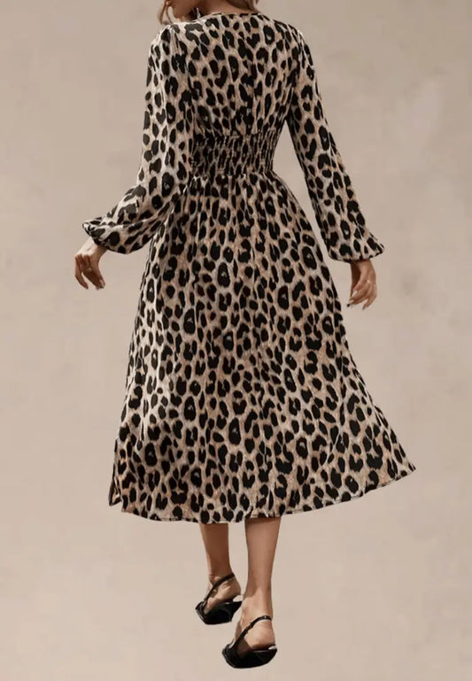 Beżowo‑czarna sukienka midi w panterkę z paskiem i długim rękawem