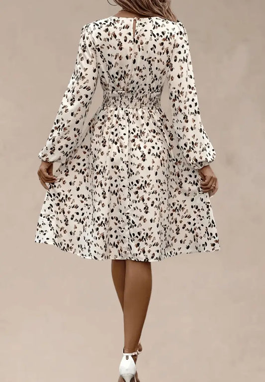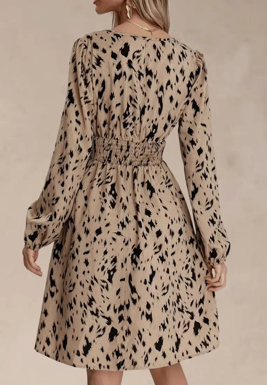 Nowy rok -69%Beżowa sukienka w cętki z dekoltem V i długim rękawem