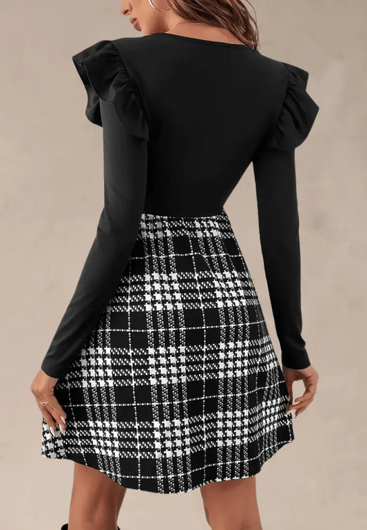 Czarna sukienka z kratkową spódnicą długi rękaw z falbankami