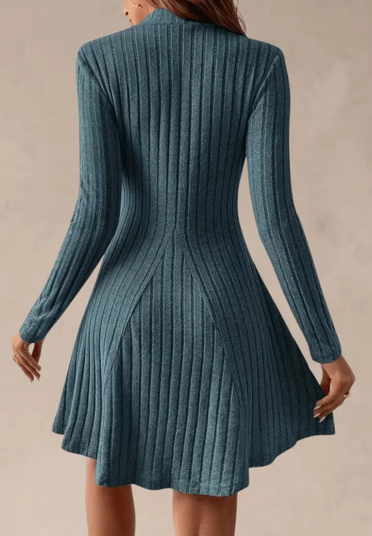 Niebieska sukienka dzianinowa prążkowana z długim rękawem
