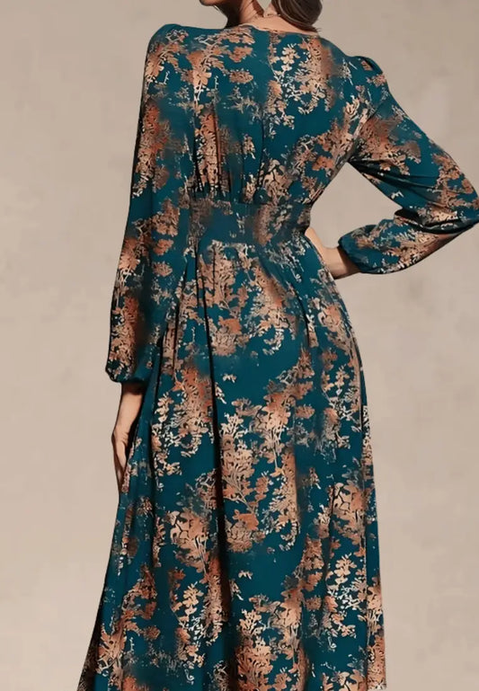 Zielona sukienka midi w kwiatowy wzór z rozcięciem i długim rękawem