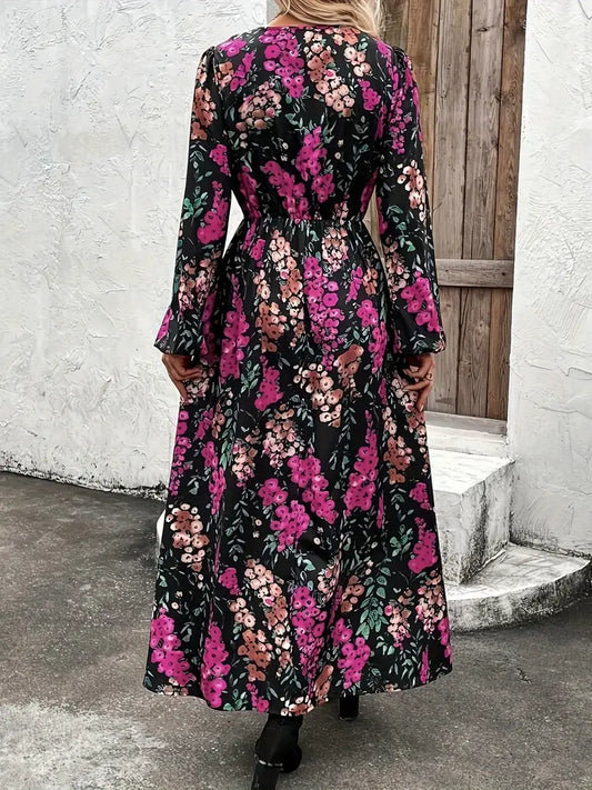Czarna sukienka maxi w różowo-brązowe kwiaty z rozcięciem na nodze