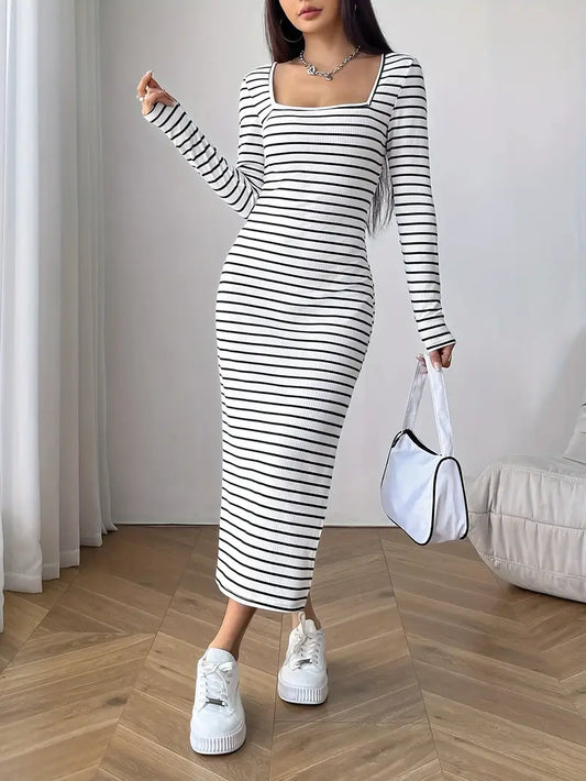 Dopasowana prążkowana sukienka midi w biało-czarne paski z długim rękawem