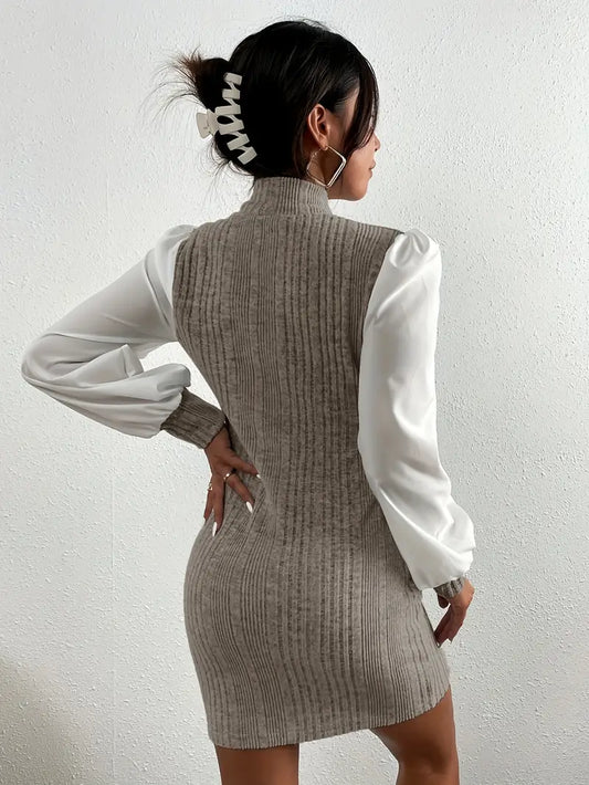 Dzianinowa sukienka mini z bufiastymi rękawami i stójką w odcieniach beżu