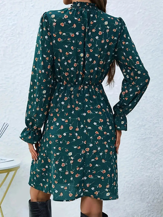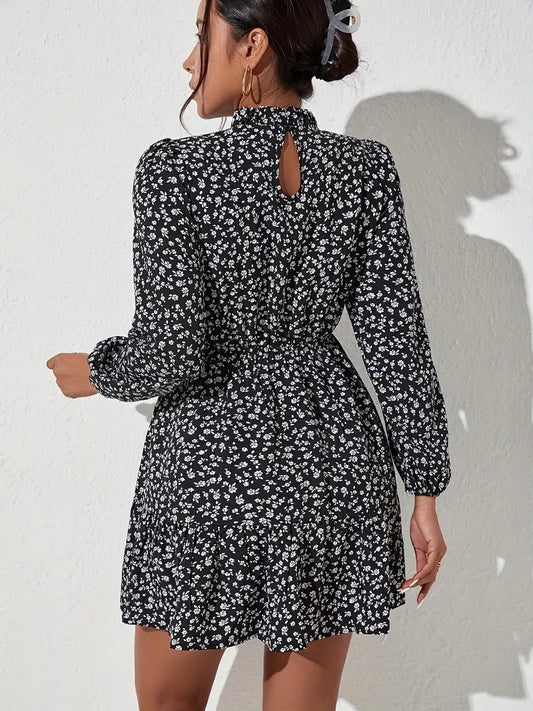 Niebieska sukienka w drobne kwiaty z długim rękawem i falbaną
