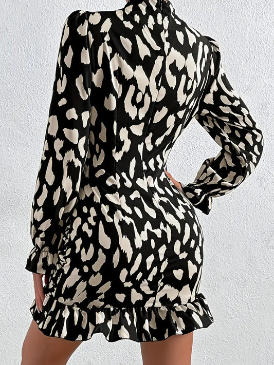 Sukienka mini z falbanką i marszczeniem w panterkę