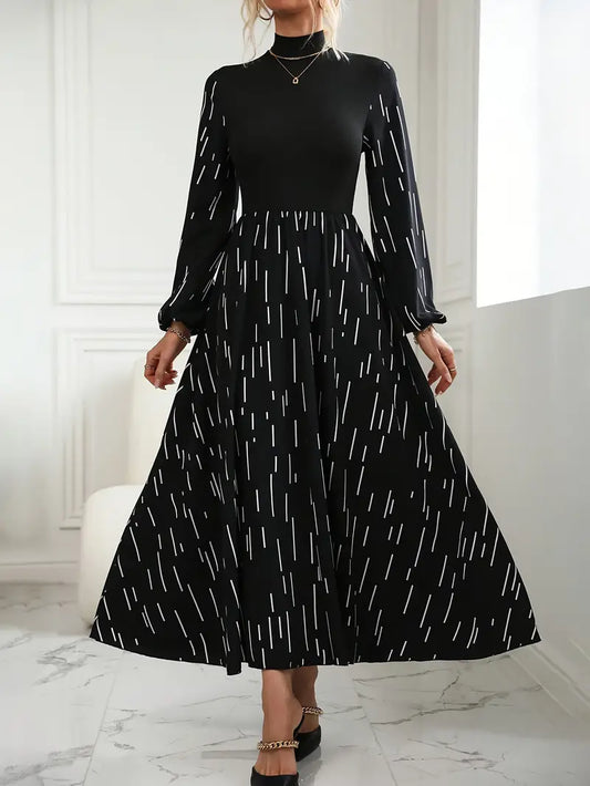 Czarna długa sukienka z wysokim kołnierzem i białym geometrycznym wzorem