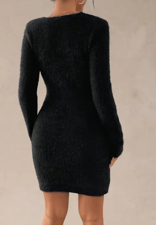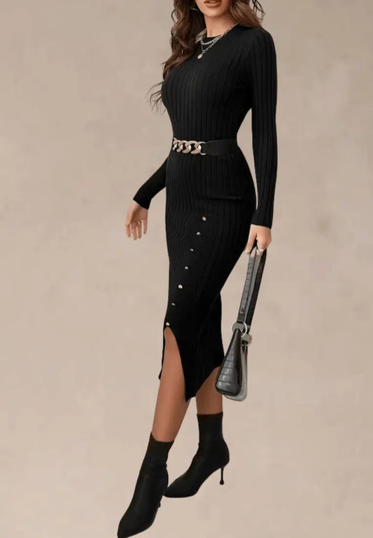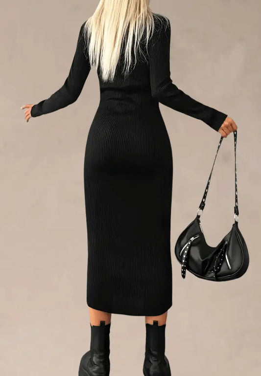 Nowy rok -70%Czarna sukienka dzianinowa z długim rękawem i rozcięciem