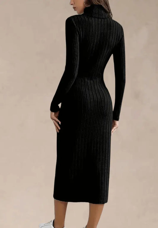 Nowy rok -70%Czarna sukienka dzianinowa midi z golfem i rozcięciem